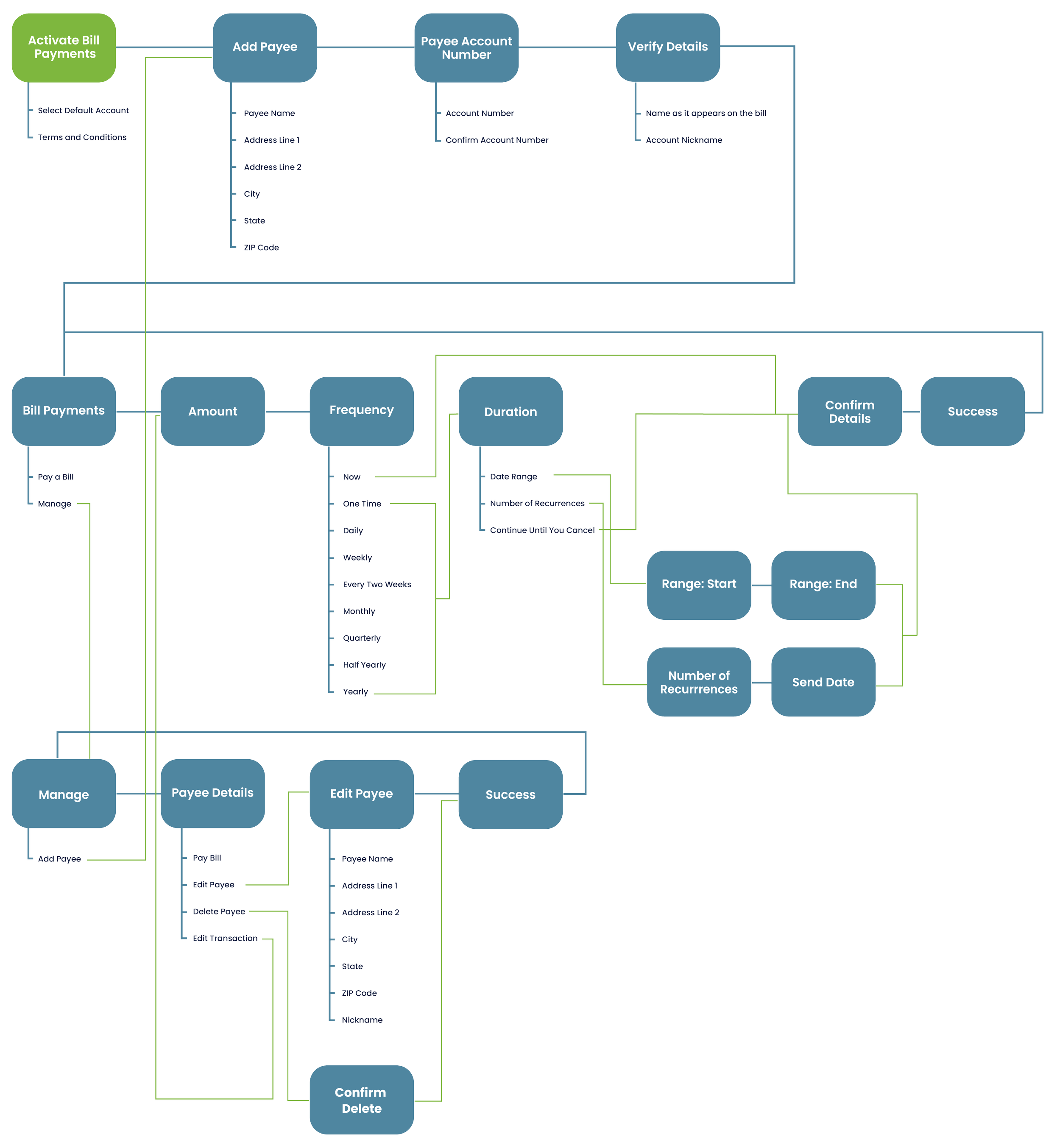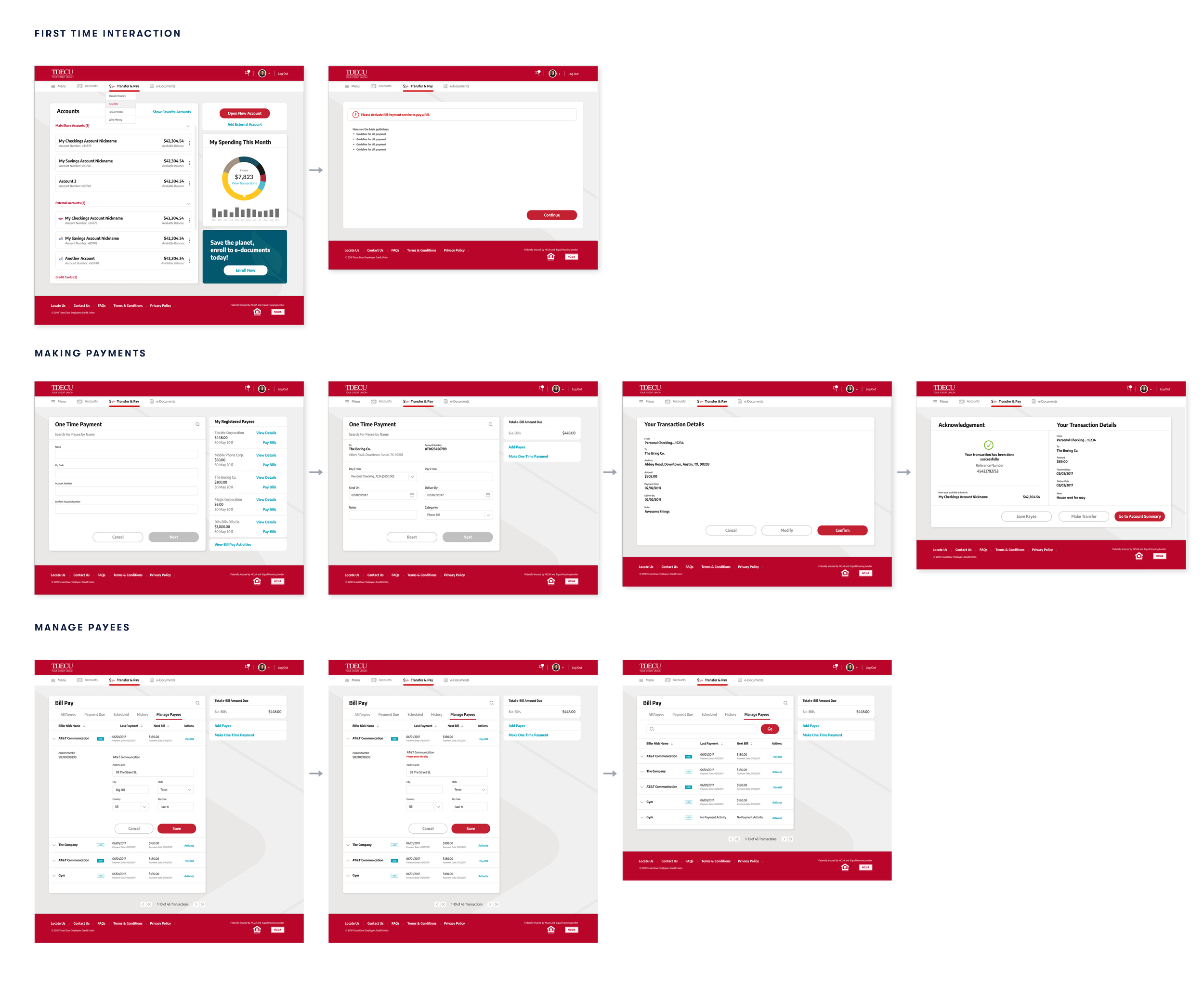 A key step in designing the Bill Payments feature was compiling all of TDECU’s requirements to ensure every payment scenario could be completed smoothly. The resulting flow maps out the exact information members need to provide, from selecting payees to confirming details, creating a clear and reliable path for transactions. By aligning business requirements with user needs, this flow served as the foundation for intuitive design decisions across both mobile and web.