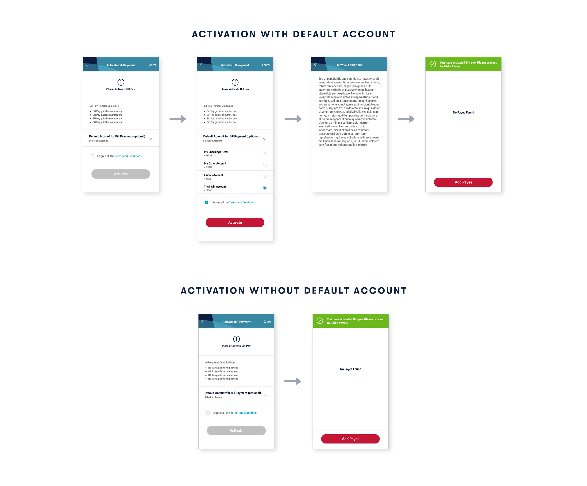The bill payment feature was designed to guide members through a seamless and intuitive experience from start to finish. First-time users are introduced to the setup process with clear guidance, accommodating scenarios with or without a default account. Key actions are highlighted at every step, ensuring users can complete their initial setup efficiently and confidently.
