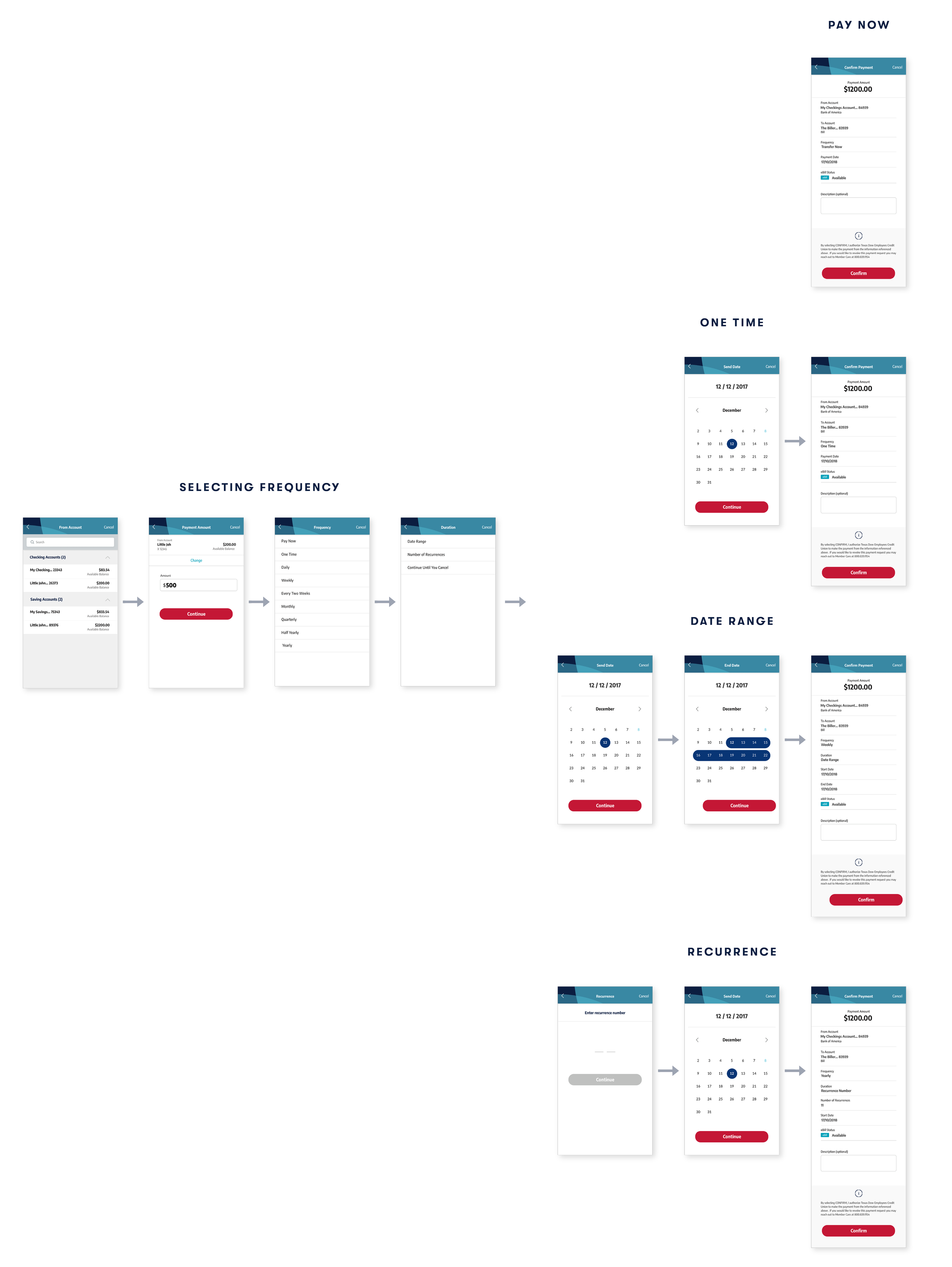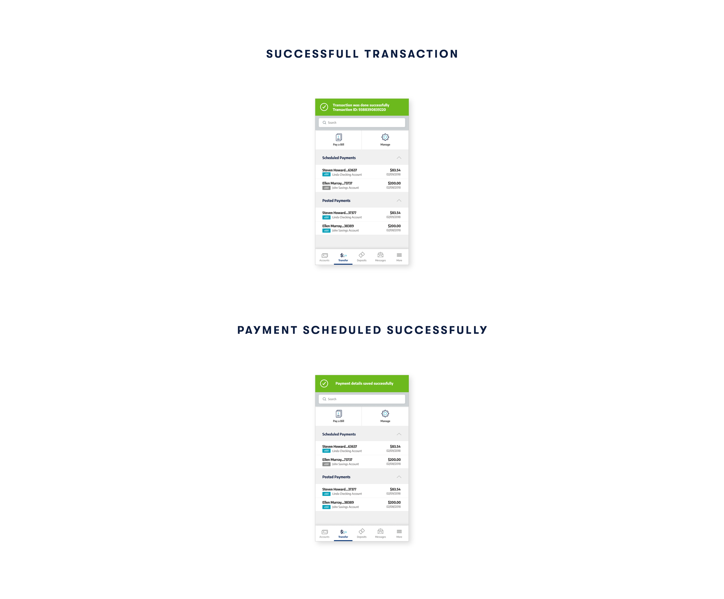 Payment options provide members full control over their transactions. Choices such as transfer now, one-time, date range, and recurring payments are clearly presented, with confirmations for successful or failed actions. These flows simplify decision-making and reduce errors, supporting both new and experienced users in completing their payments confidently.